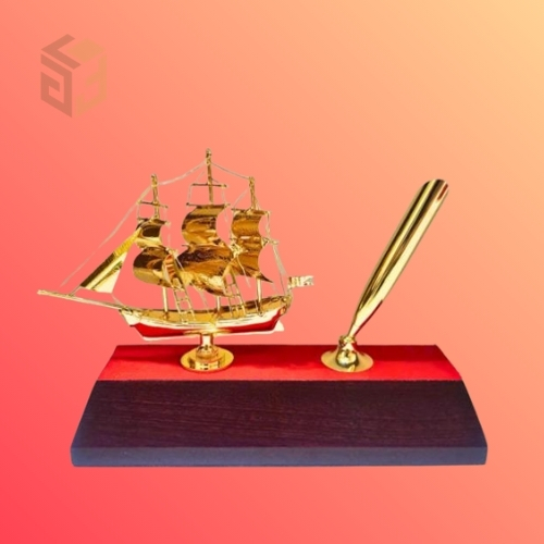 4. Sét Quà Tặng Doanh Nhân VIP: Thuyền buồm mạ vàng đặt trên đế gỗ quý, đi kèm với bút ký cao cấp hoặc đồng hồ để bàn đồng bộ.